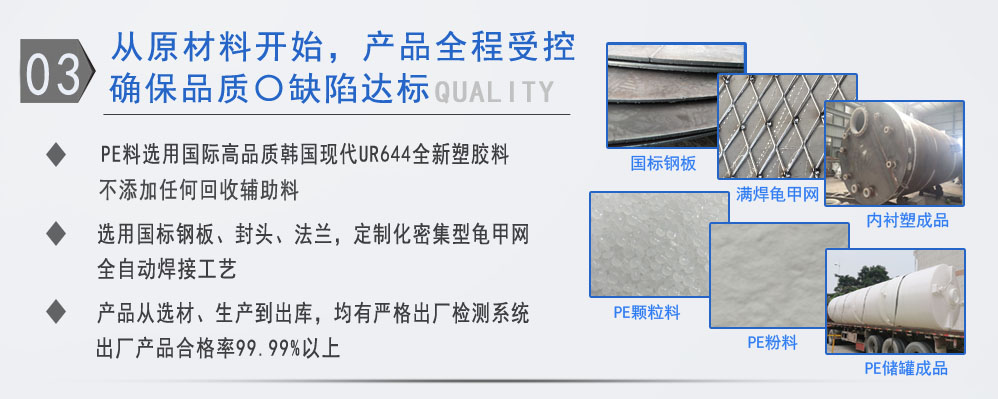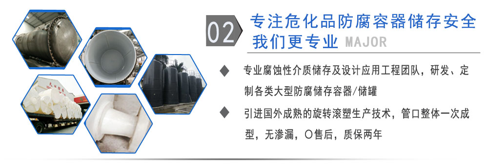 公司有鋼襯塑PE/PO、PE全塑、碳鋼、不銹鋼四大系列100多個品種,專注于常壓儲存容器生產,其產品包括鋼襯塑儲罐管口一體成型PE儲罐碳鋼儲罐、不銹鋼儲罐、反應釜、攪拌罐、離子交換柱、鋼襯PE/PO儲罐塑料儲罐鹽酸儲罐硫酸儲罐等等。更大限度滿足廣大客戶的各種需求,同時可以根據客戶的需要加工定制各種防腐設備。